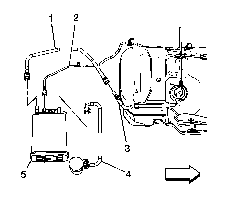 11. Disconnect and remove the middle EVAP vapor line (1) from the fuel tank (3) and the EVAP canister (5). Refer to Plastic Collar Quick Connect Fitting Service (Plastic Collar Quick Connect Fitting Service).