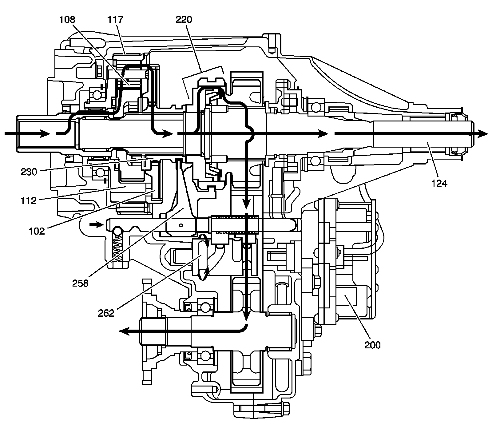 The outer teeth, or low range teeth, on the input shaft (105), which now acts like a sun gear, delivers the engine power to the pinion gears (108) in the planetary carrier (112). Rotating the pinion gears (108), which are engaged in the annulus gear (117), rotates the planetary carrier (112). The planetary carrier (112) delivers the power to the high/low range sleeve (230). The high/low range sleeve (230) then drives the rear output shaft (124), providing a 2.48:1 reduction to the speed of the rear output shaft (124). The 2/4 wheel drive synchronizer is still engaged, and engine torque is delivered to front and rear propeller shafts.