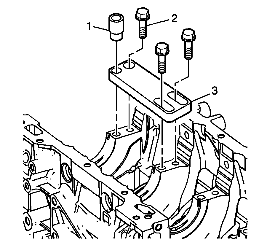 9. In order to tap the new threads for the insert to the proper depth, rotate the tap into the crankshaft main cap bolt hole until the mark (3) on the tap aligns with the top of the drill bushing (2).