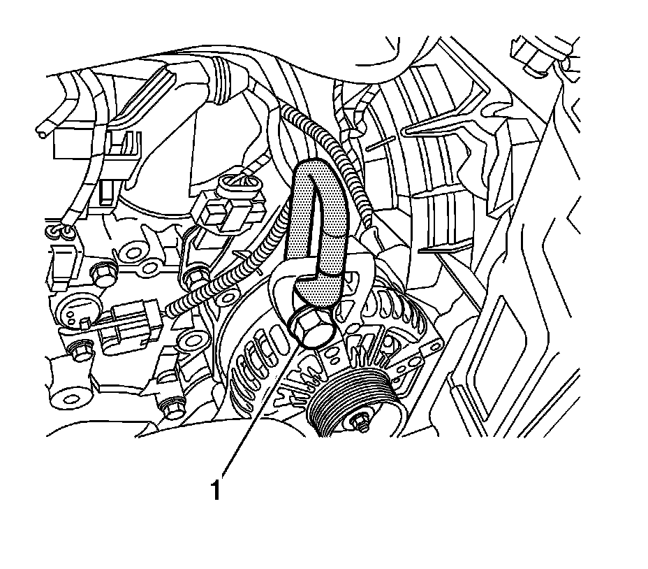 7. Remove the alternator bolt (1), then install the alternator bolt with the engine support bracket J 42451-1 to the engine and tighten to 50 Nm (37 lb ft).