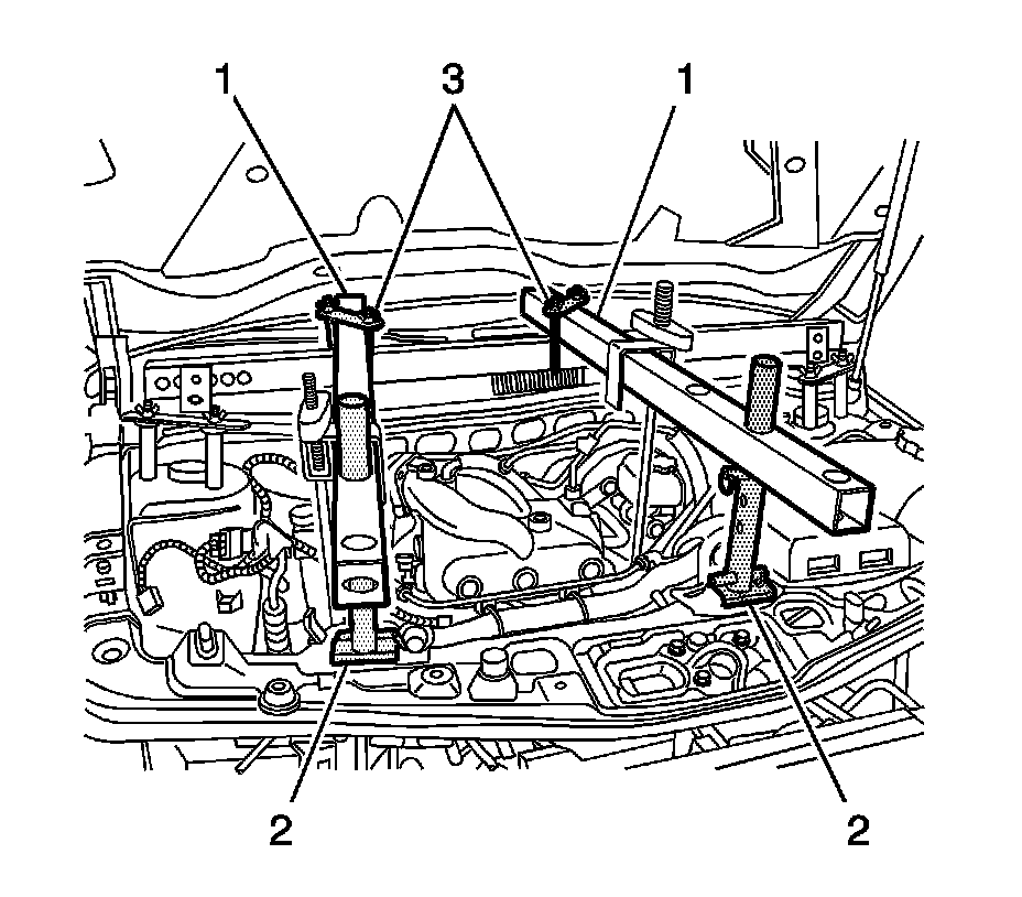 4. Install a 127 cm (50 in) engine support fixture cross bar J 28467-B (3) transversely across the vehicle between both J 28467-5 strut tower adapters (2).