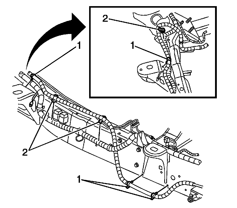 11. Remove the positive cable to the chassis harness clips (2).