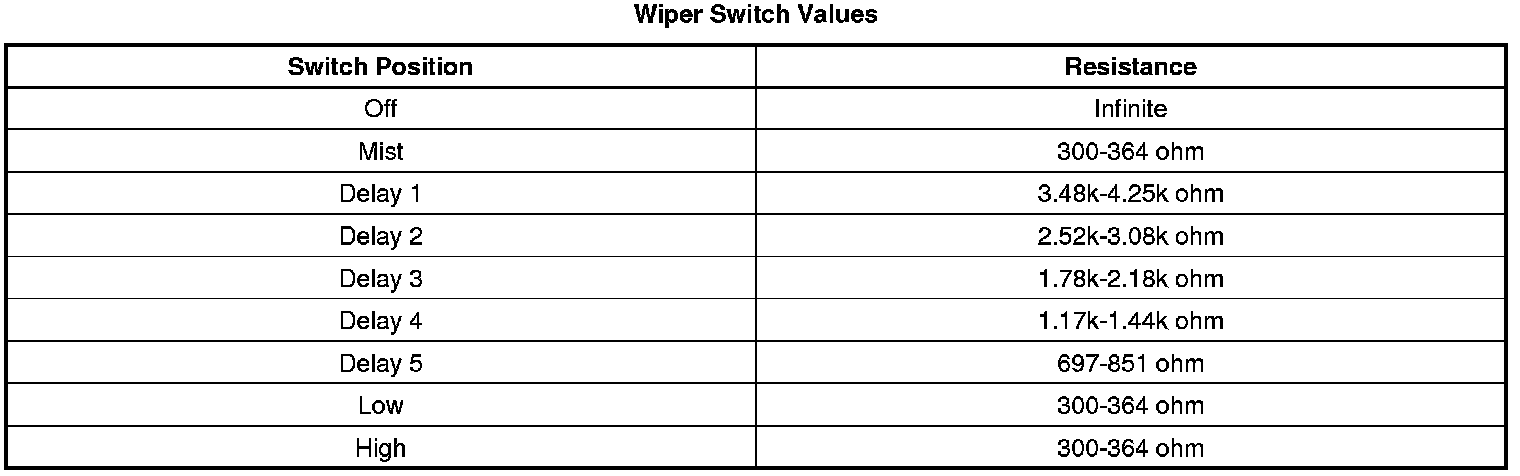 5. Ignition ON, operate the windshield wiper switch through the Delay, Low, and High positions.