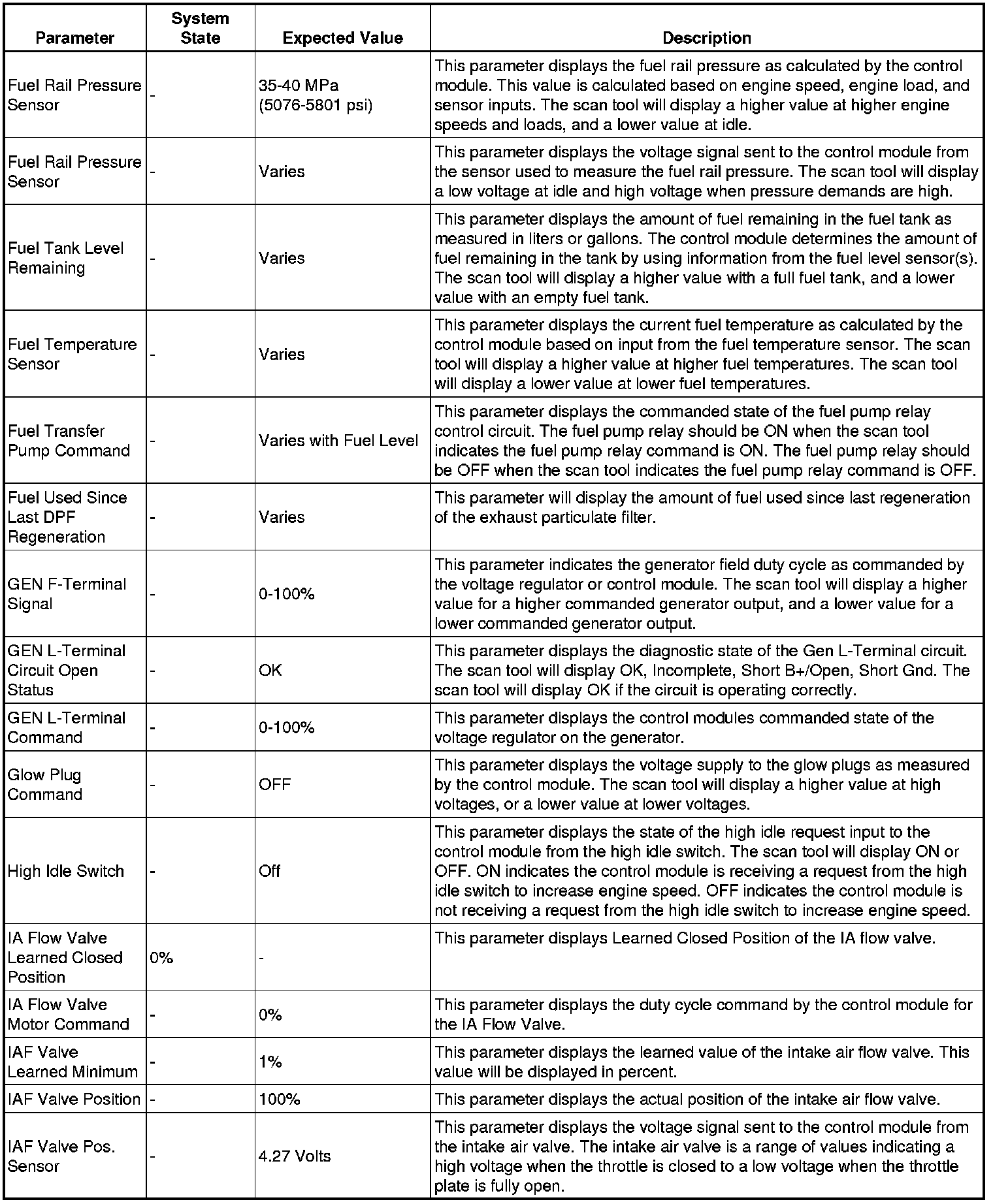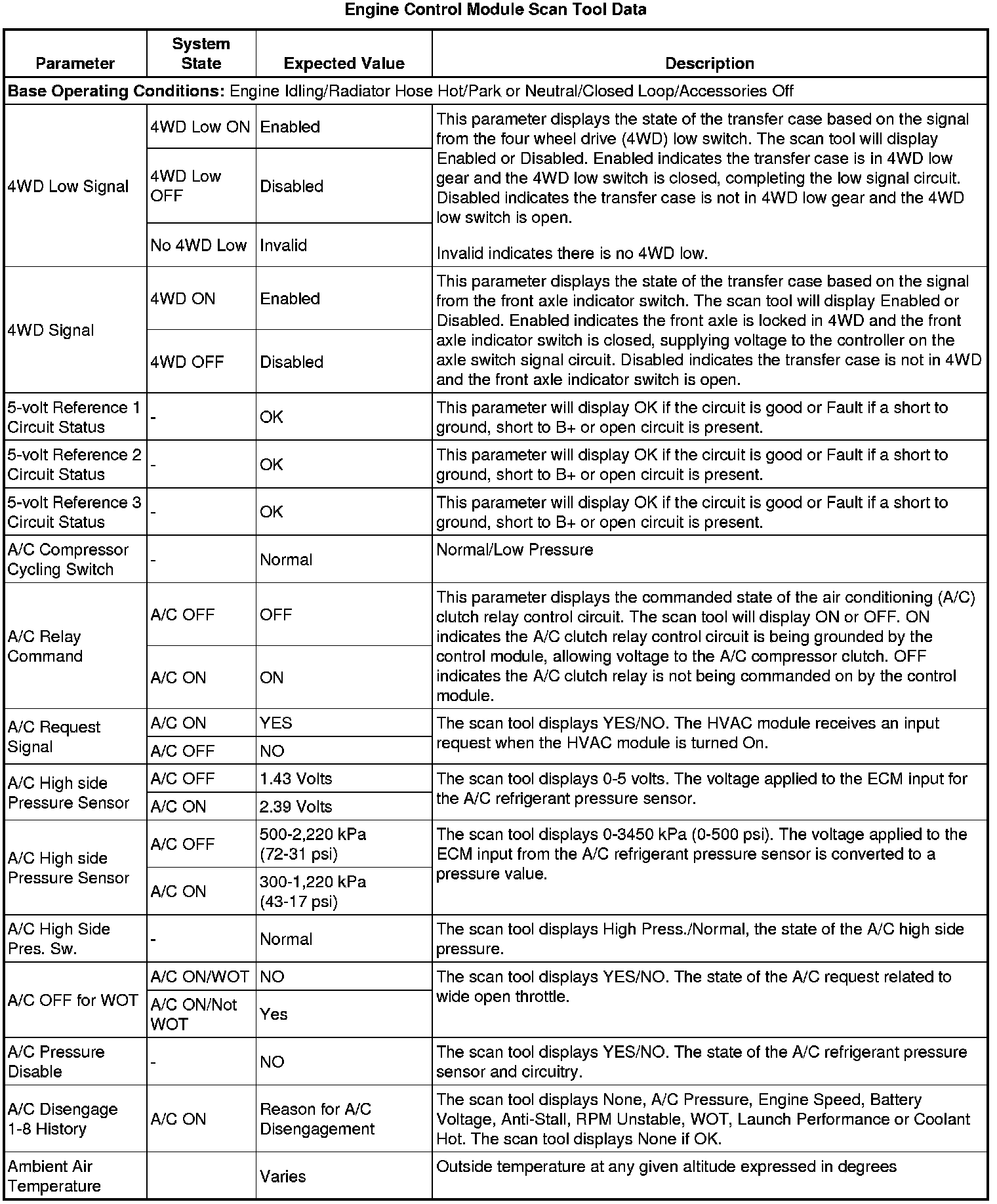 The scan tool values from a properly running engine may be used for comparison with the engine you are diagnosing. The Engine Scan Tool Data List represents values that would be seen on a normally running engine.