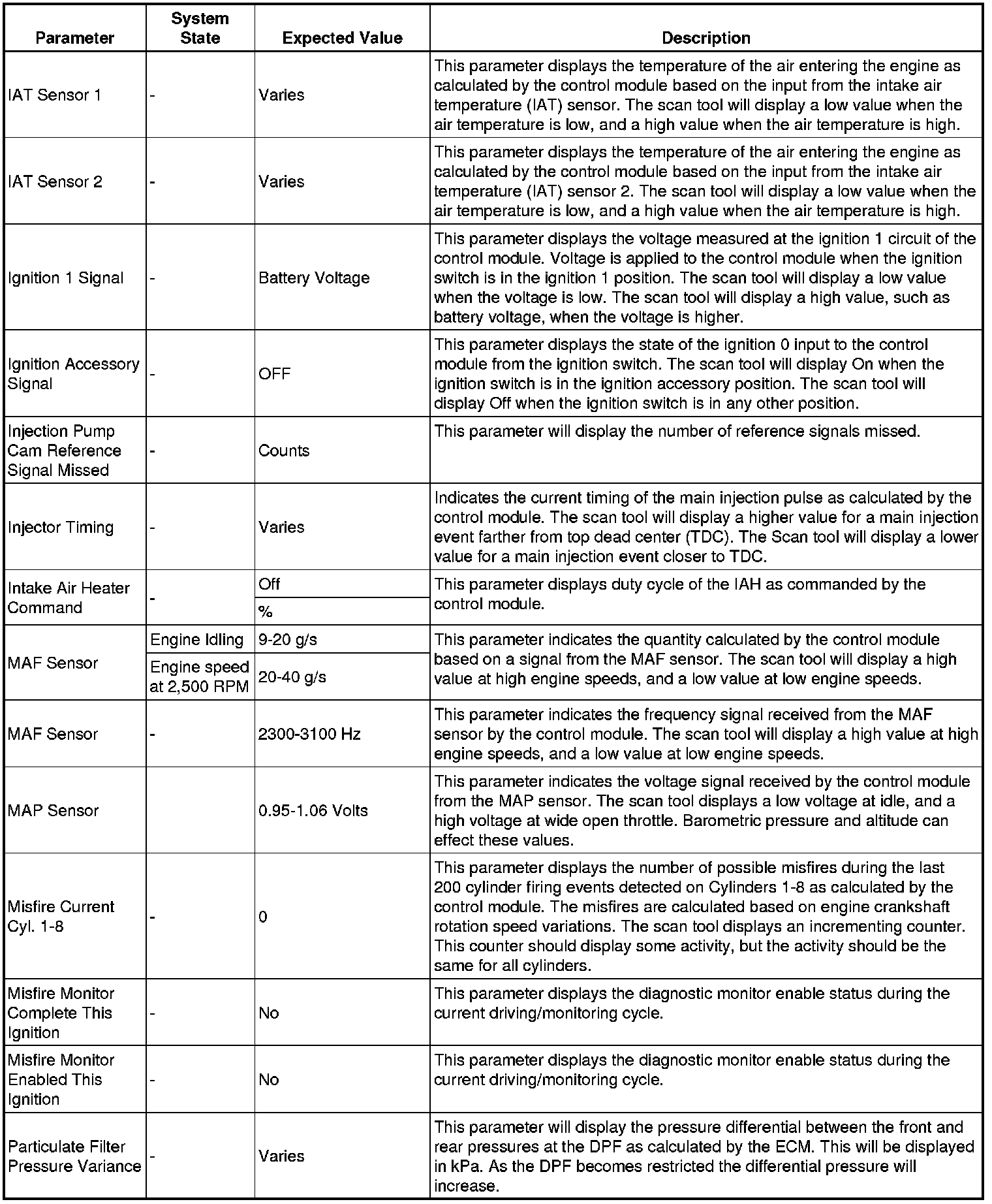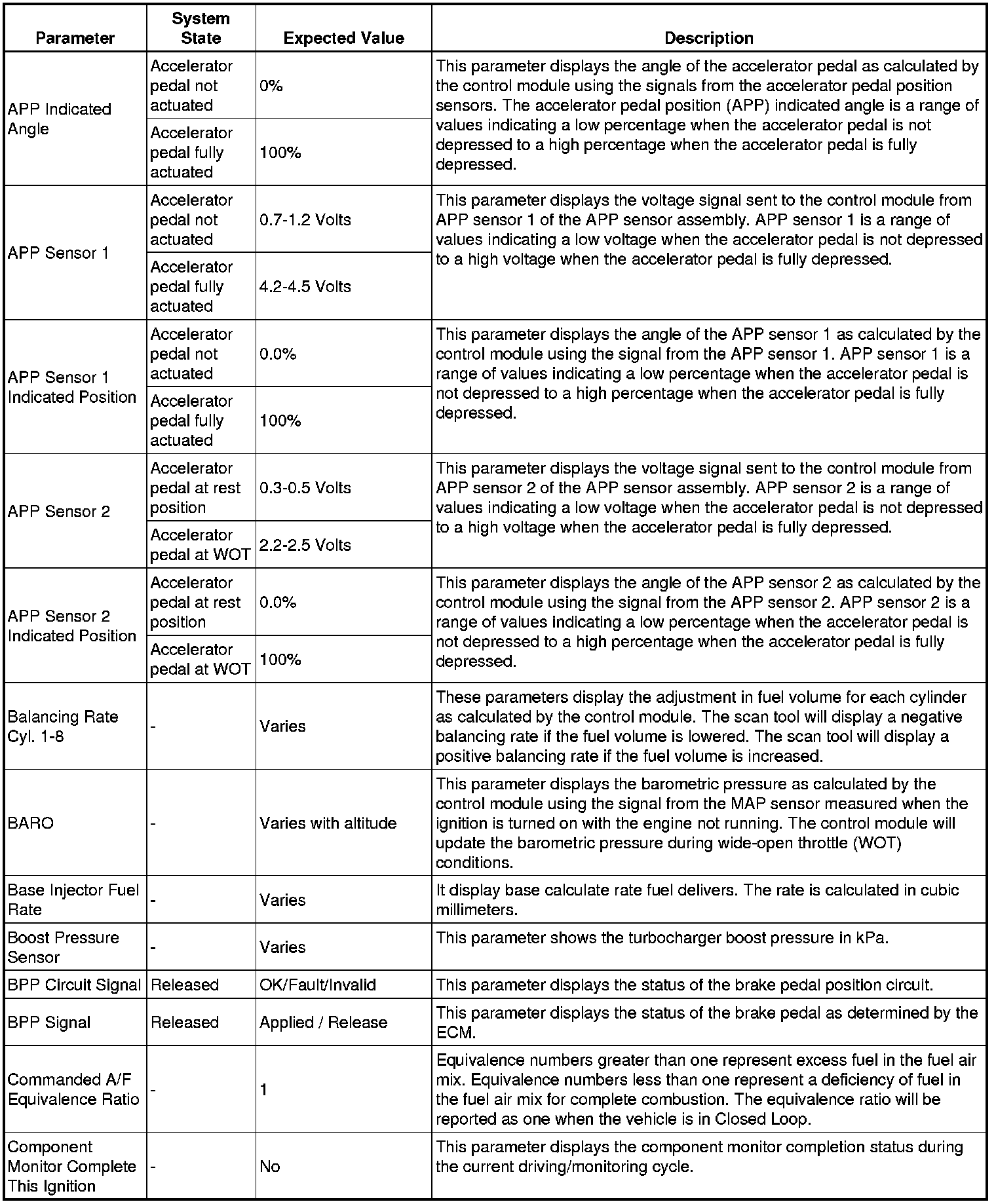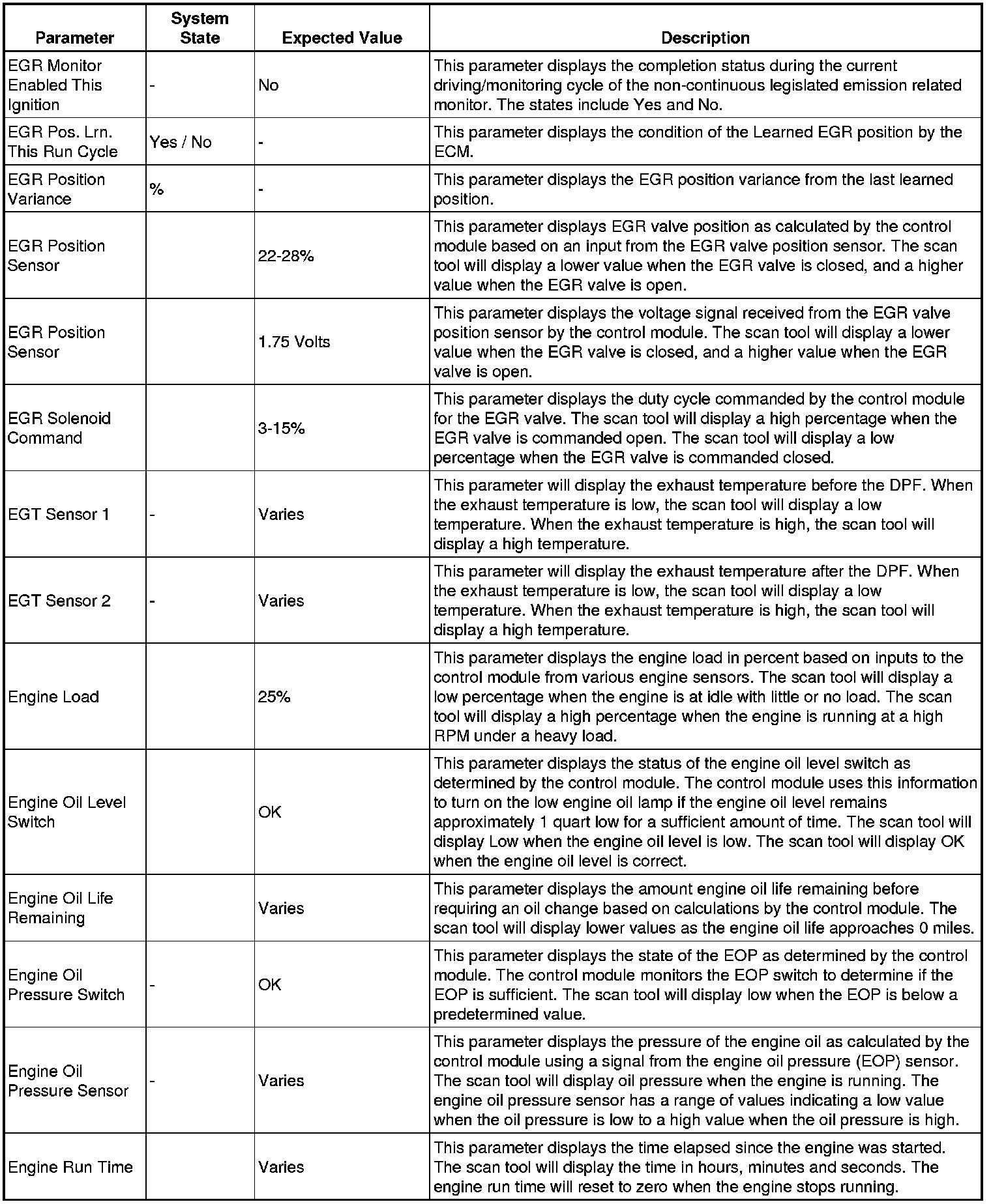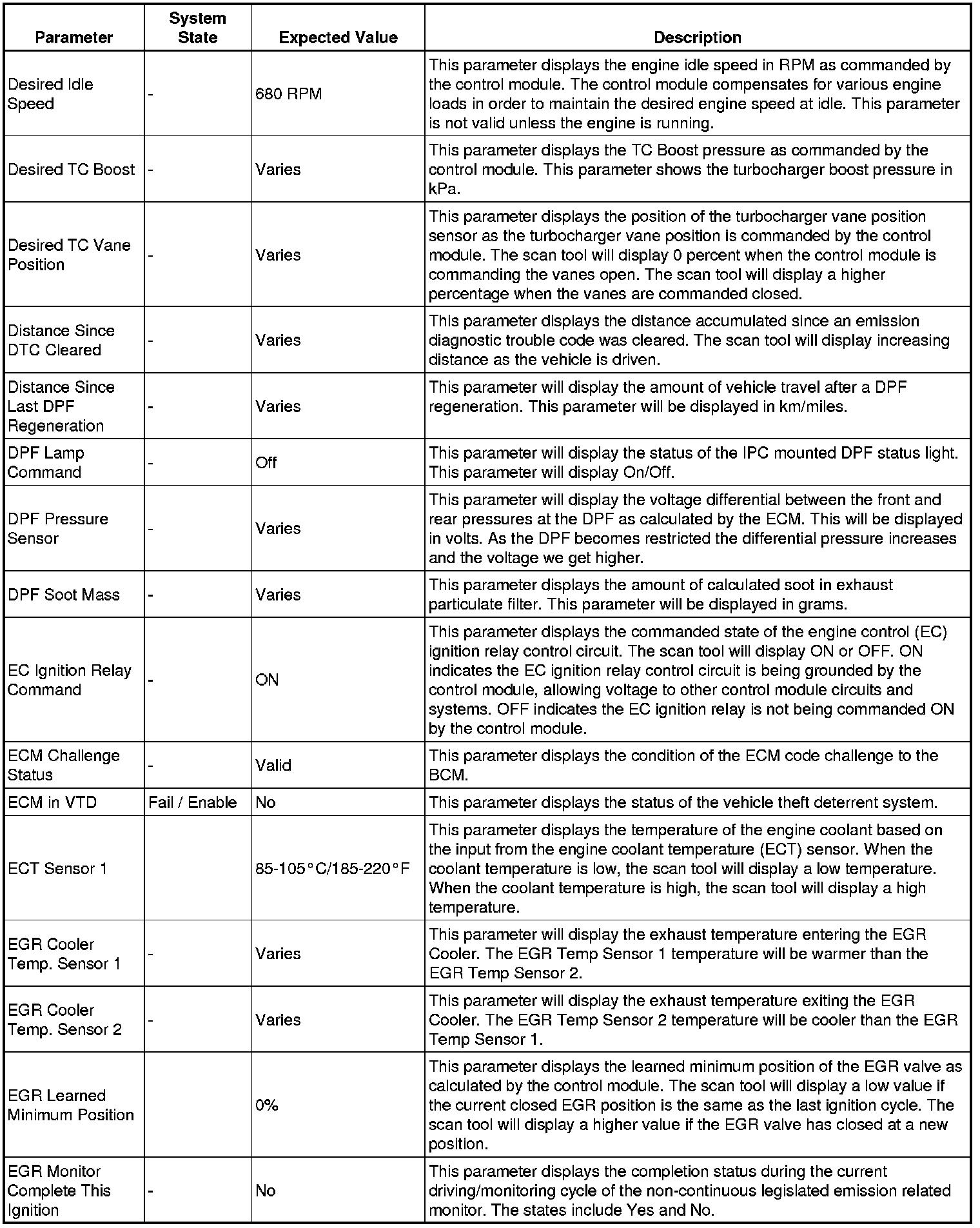 The Engine Control Module Scan Tool Data List contains all engine-related parameters that are available on the scan tool. The list is arranged in alphabetical order. A given parameter may appear in any one of the data lists, and in some cases may appear more than once, or in more than one data list in order to group certain related parameters together.