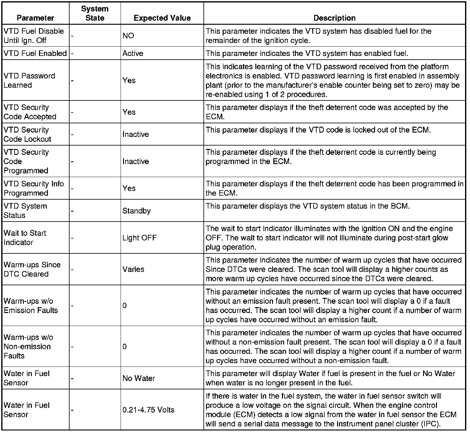 Only the parameters listed below are referenced in this service manual for use in diagnosis.