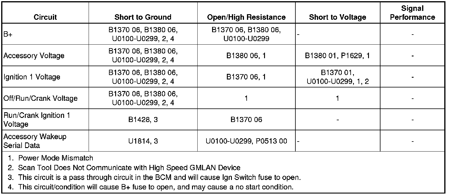 The vehicle power mode master (PMM) is the body control module (BCM). The ignition switch is a low current switch with multiple discrete ignition switch signals to the PMM for determination of the power mode. The PMM receives the ignition switch signals, and additionally a reference voltage signal from the BCM, through the ignition switch, and back to the BCM. There are redundancies within the PMM system that can allow operation of certain subsystems when there are faults in the ignition switch circuits. Other information such as serial data input from other modules and DTCs is also used to determine what power mode signals and information is transmitted by the PMM. The BCM logic uses all this information to identify the operator's desired power mode and activate specific discrete signals, and serial data messages for the operation of different subsystems as necessary. Other modules which have switched voltage inputs may operate in a default mode if the PMM serial data message does not match what the individual module can detect from its own connections.