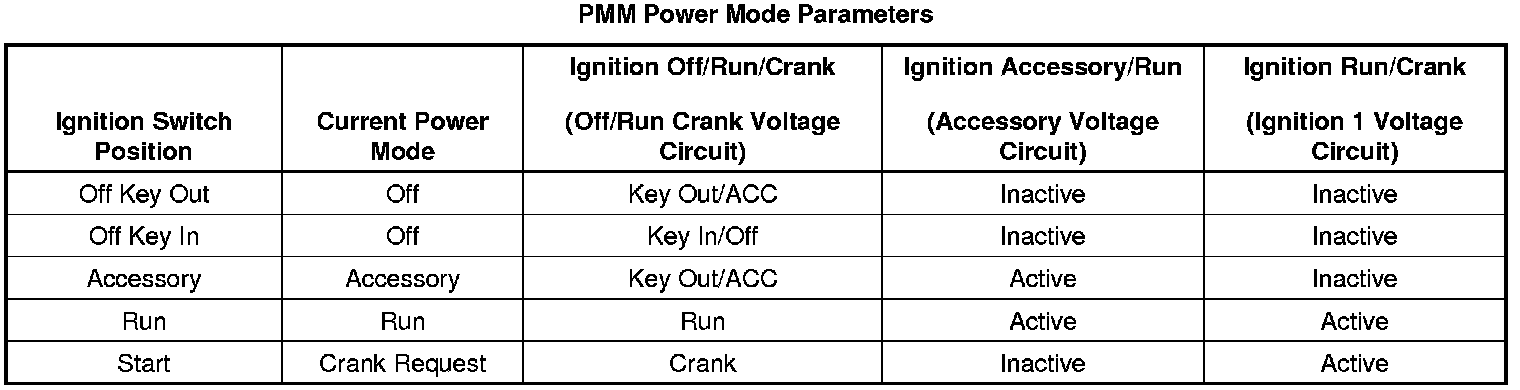 Verify that all the parameters listed in the following table correspond to the ignition key position. The PMM Power Mode parameters table below illustrates the correct state of these parameters (circuits) with the corresponding ignition switch positions. The circuits related to the parameters are in parenthesis.