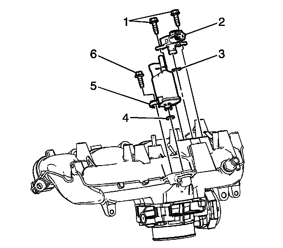 8. Install the EVAP purge solenoid (5) and bolt (6) and tighten the bolt to 10 Nm (89 lb in).