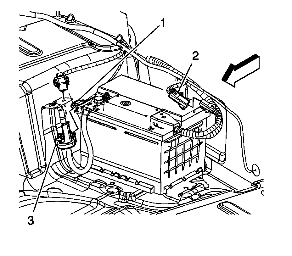 12. Remove the positive battery cable (2) from the clips (3) on the body harness.