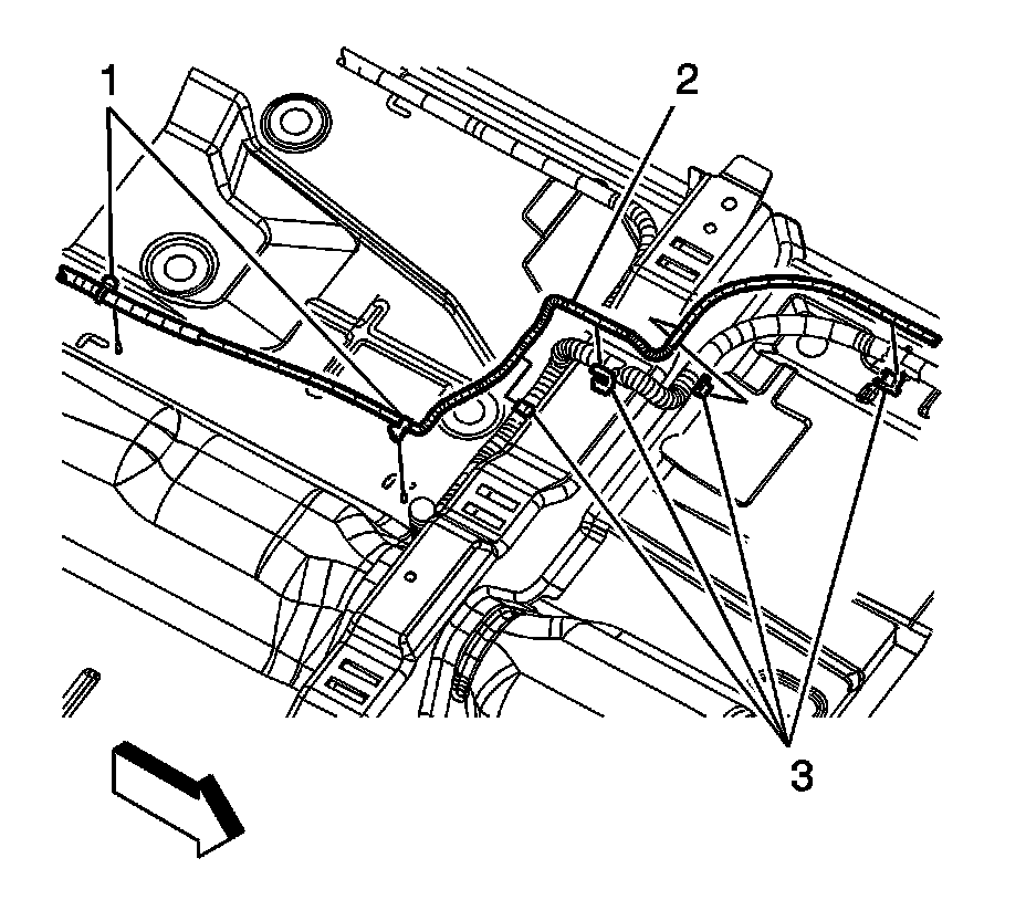 17. Remove the positive battery cable (3) from the clips (1) on the body harness.