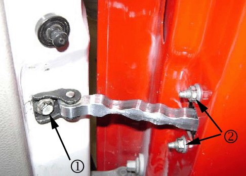 7. Remove the "B" pillar bolt (1) and the nuts (2) retaining the check link to the door.