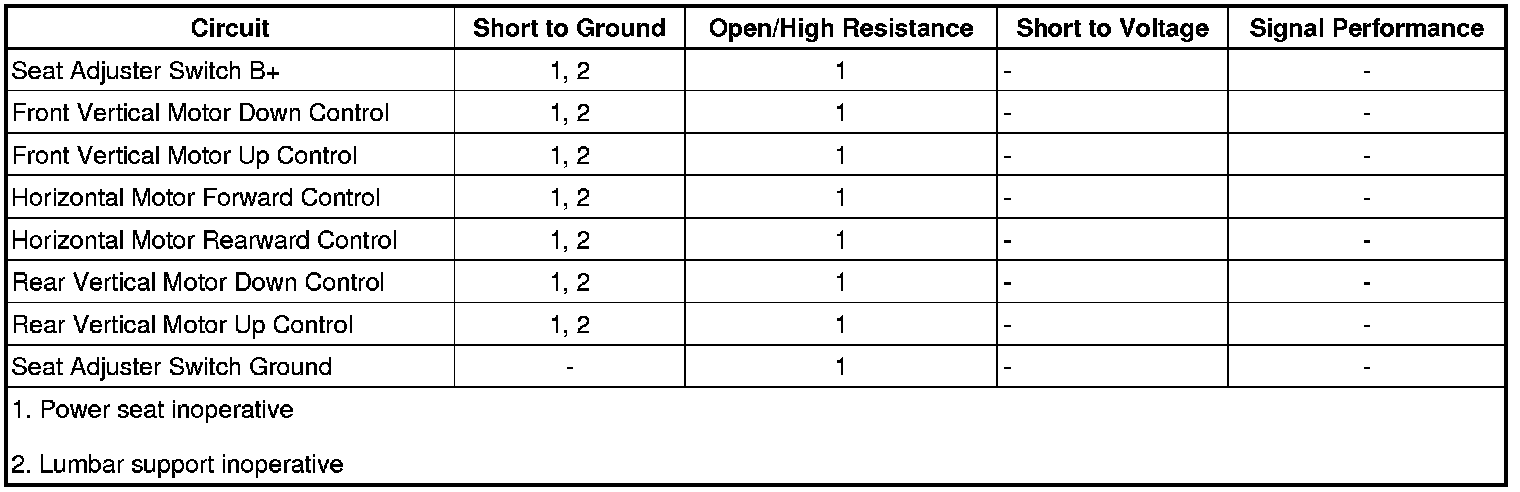 If the power seat is inoperative in all directions, refer to the Seat Adjuster Switch Circuit Test.