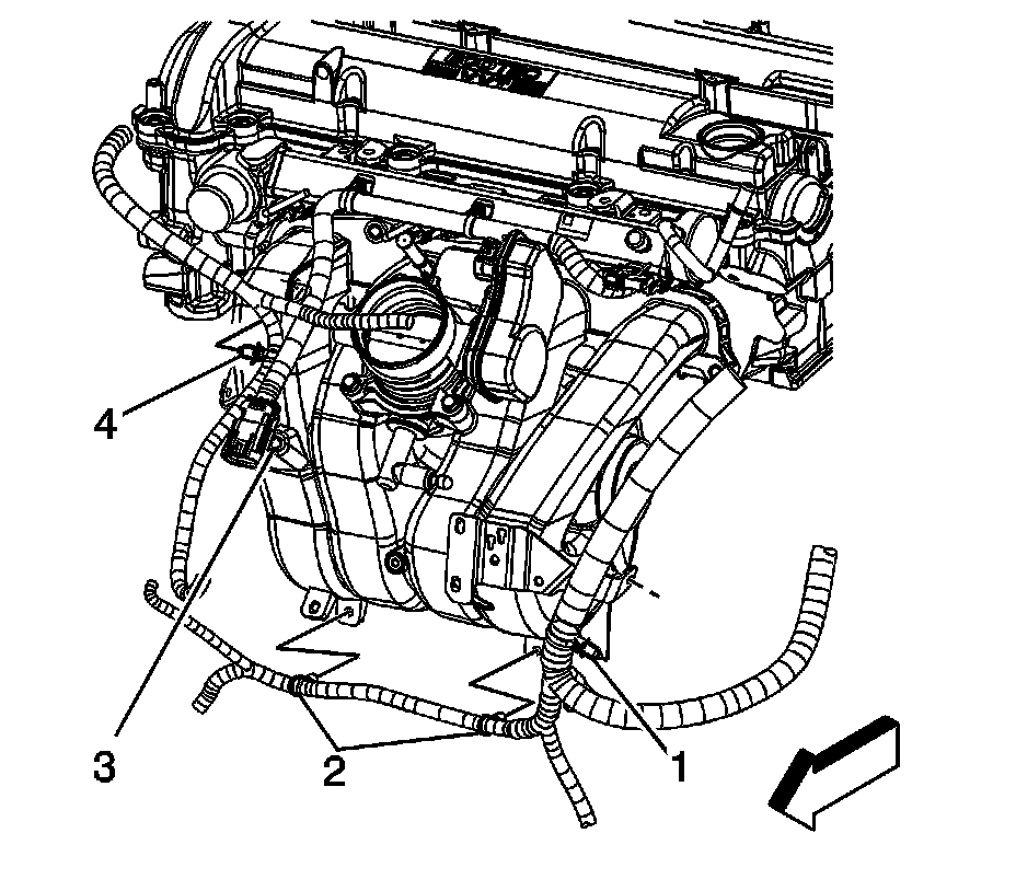 12. Connect the engine harness clips (2 and 4) to the intake manifold.