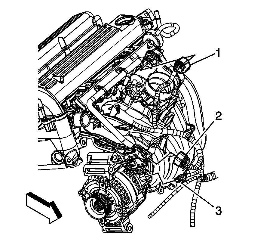 9. Connect the fuel injector electrical connector clip (3) to the intake manifold.
