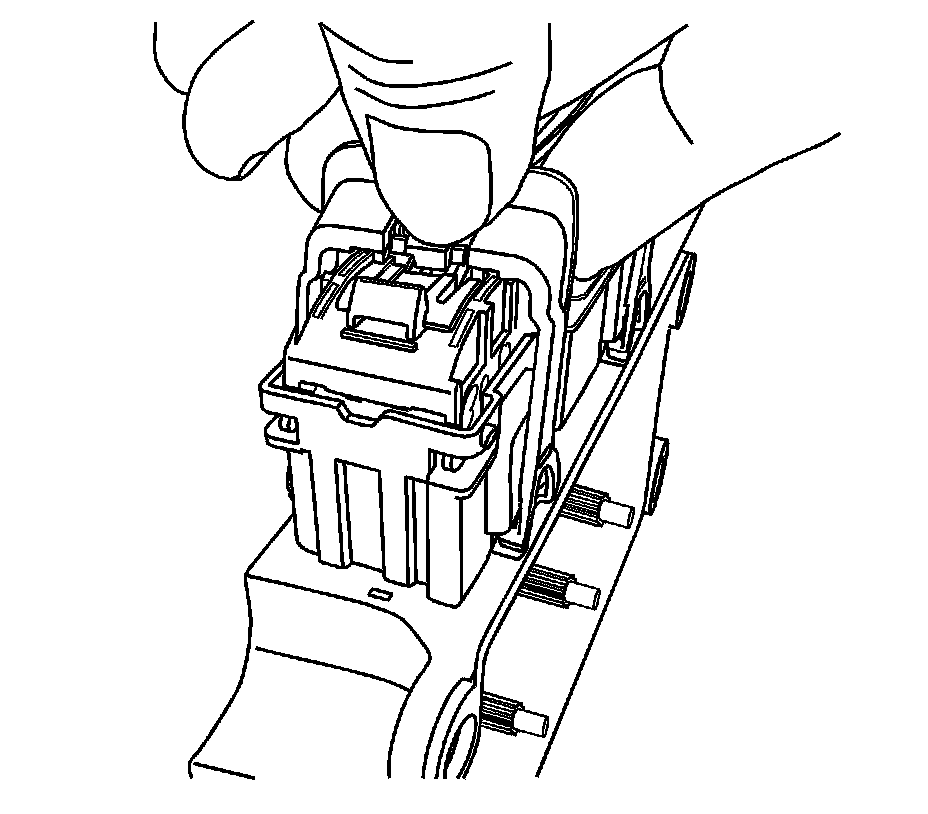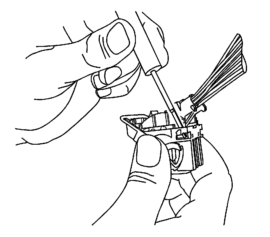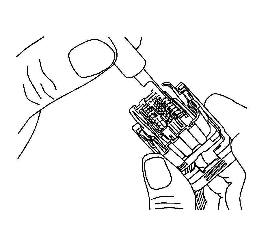 6. Using terminal release tool J-38125-215A, place the tip of the tool on the outside edge next to the terminal and depress the lock tab and remove the back side of the connector body.
