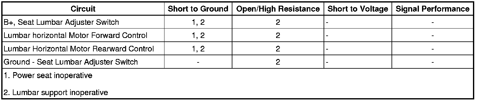 B+ is supplied to the lumbar adjuster switch from the PWR SEAT circuit breaker. Ground is supplied to the lumbar adjuster switch from G301. When the lumbar adjuster switch is pressed to increase or decrease lumbar support, the lumbar adjuster switch provides voltage and ground to the appropriate terminals of the seat lumbar motor.