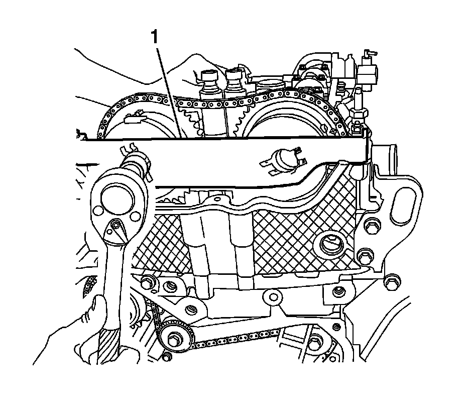 8. Install the timing chain retention tool EN-48749 (1) to the exhaust side of the timing chain.