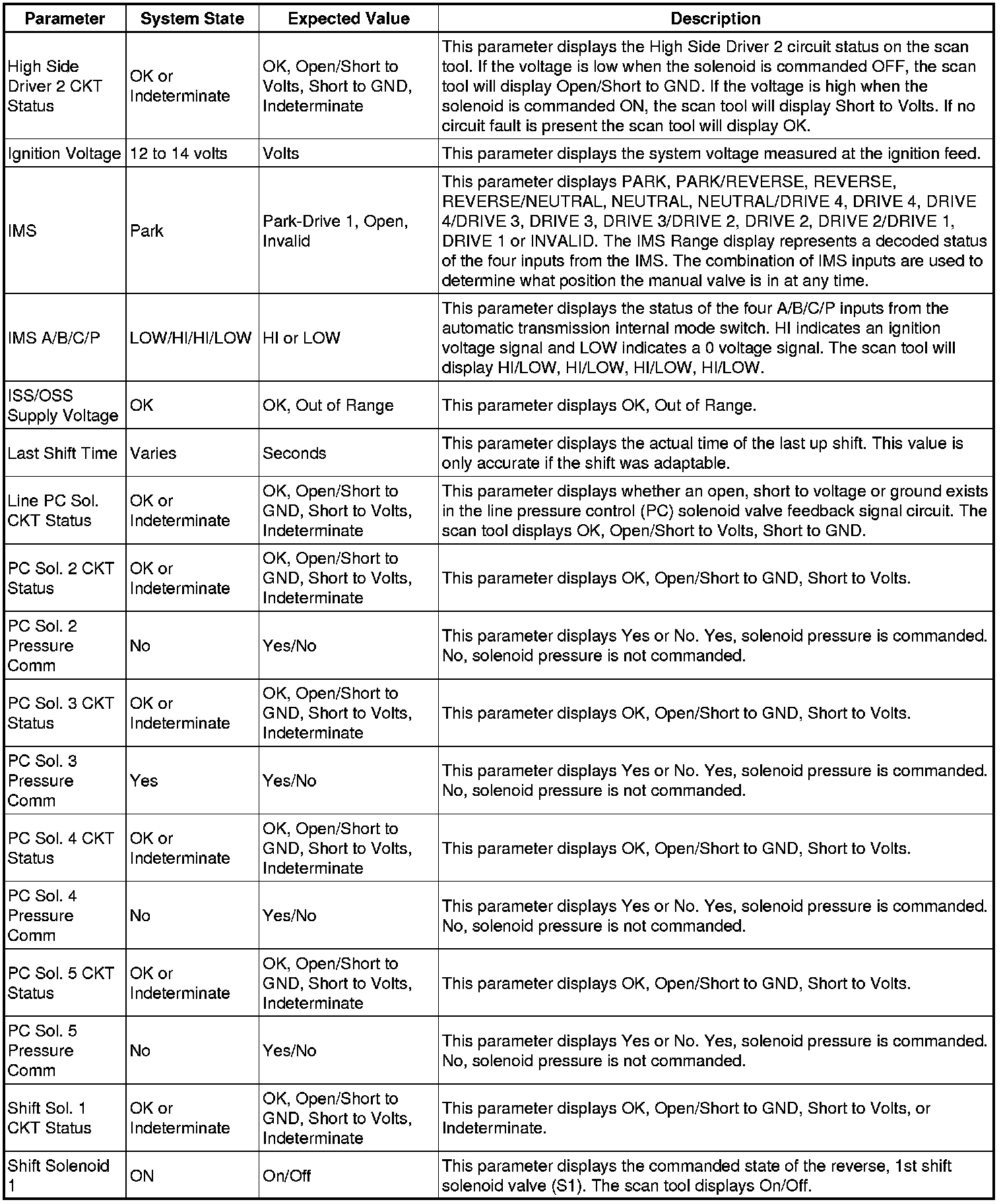 The Transmission Control Module Scan Tool Data List contains all transmission related parameters that are available on the scan tool. The list is arranged in alphabetical order. A given parameter may appear in any one of the data lists, and in some cases may appear more than once, or in more than one data list in order to group certain related parameters together.
