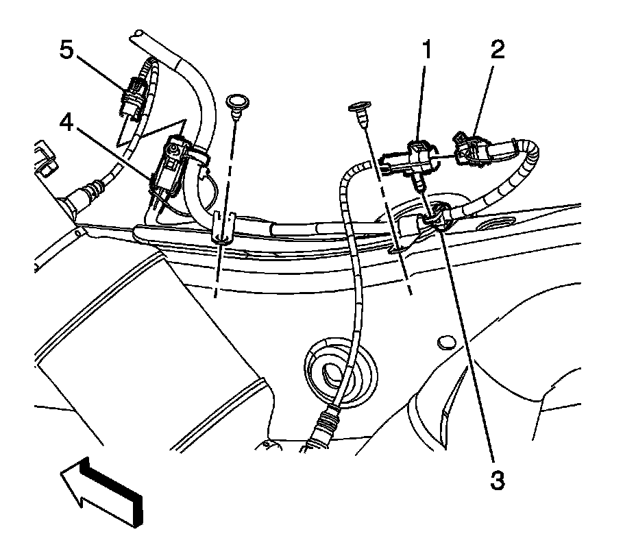 5. Disconnect the right front heated oxygen sensor (HO2S) electrical connector (5) from the engine wiring harness electrical connector (4).