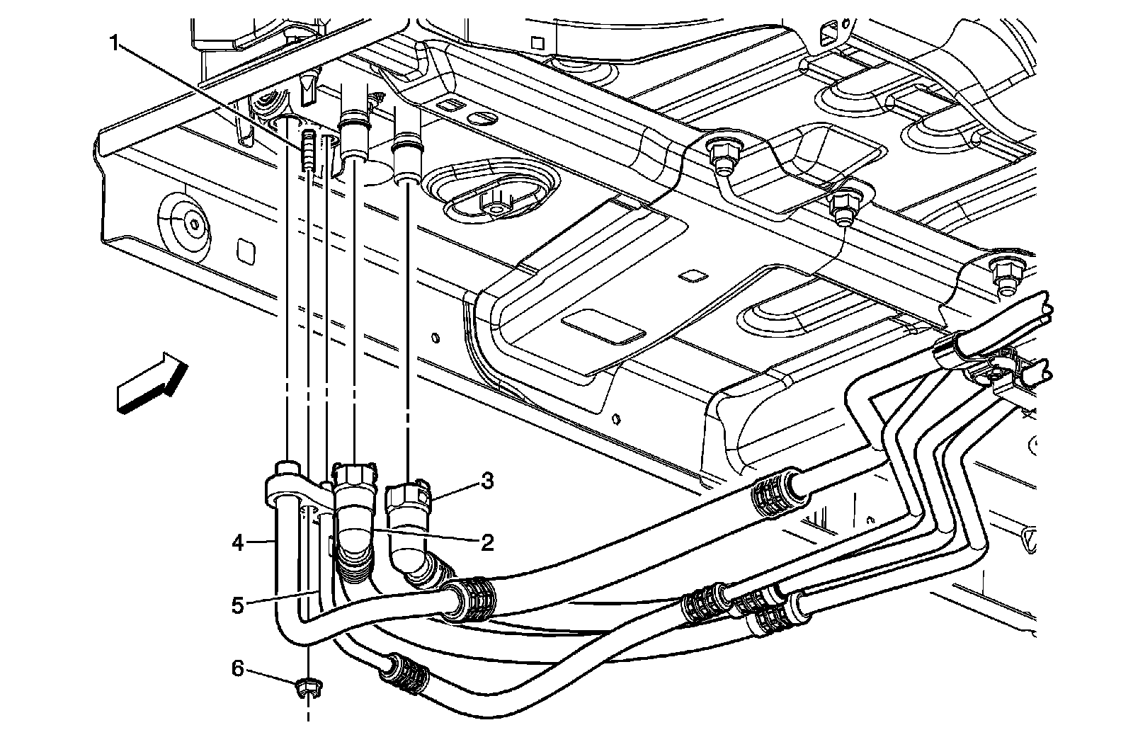 4. Disconnect the heater lines (2, 3) from the auxiliary HVAC module at the underside of the vehicle.