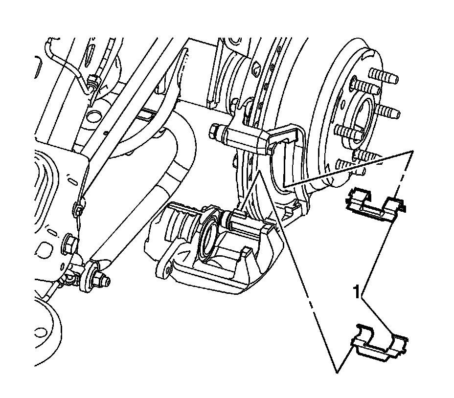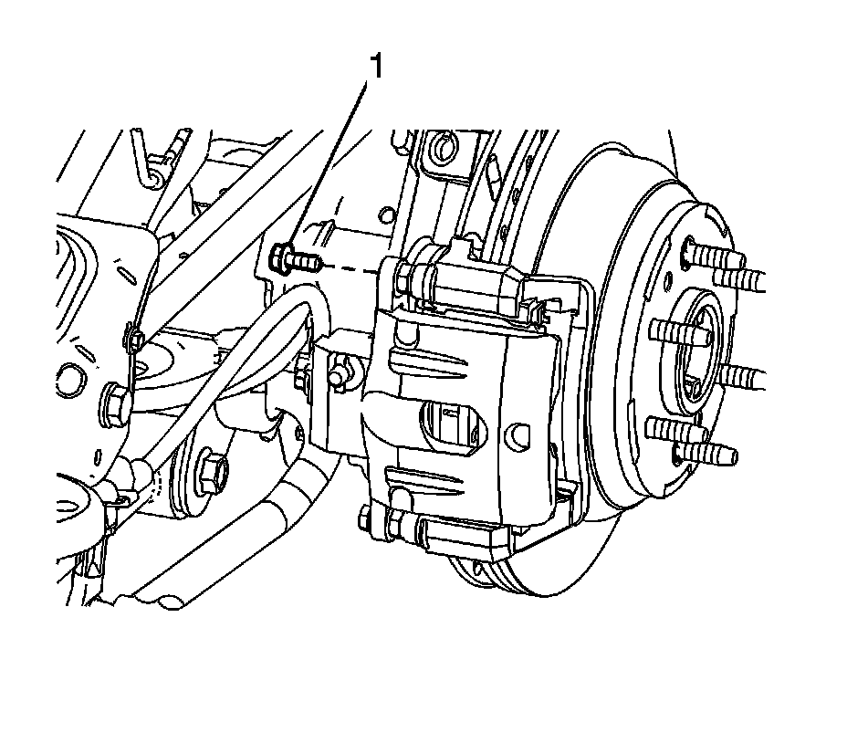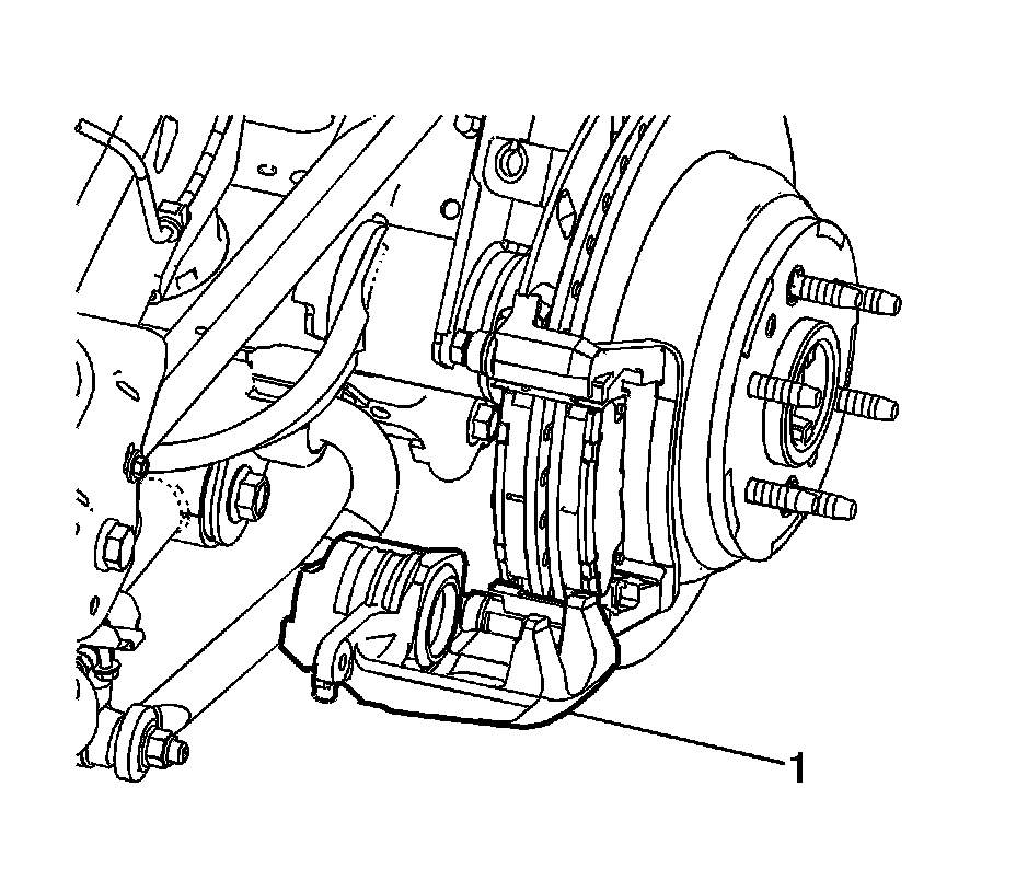 Caution: Support the brake caliper with heavy mechanic wire, or equivalent, whenever it is separated from its mount and the hydraulic flexible brake hose is still connected. Failure to support the caliper in this manner will cause the flexible brake hose to bear the weight of the caliper, which may cause damage to the brake hose and in turn may cause a brake fluid leak.