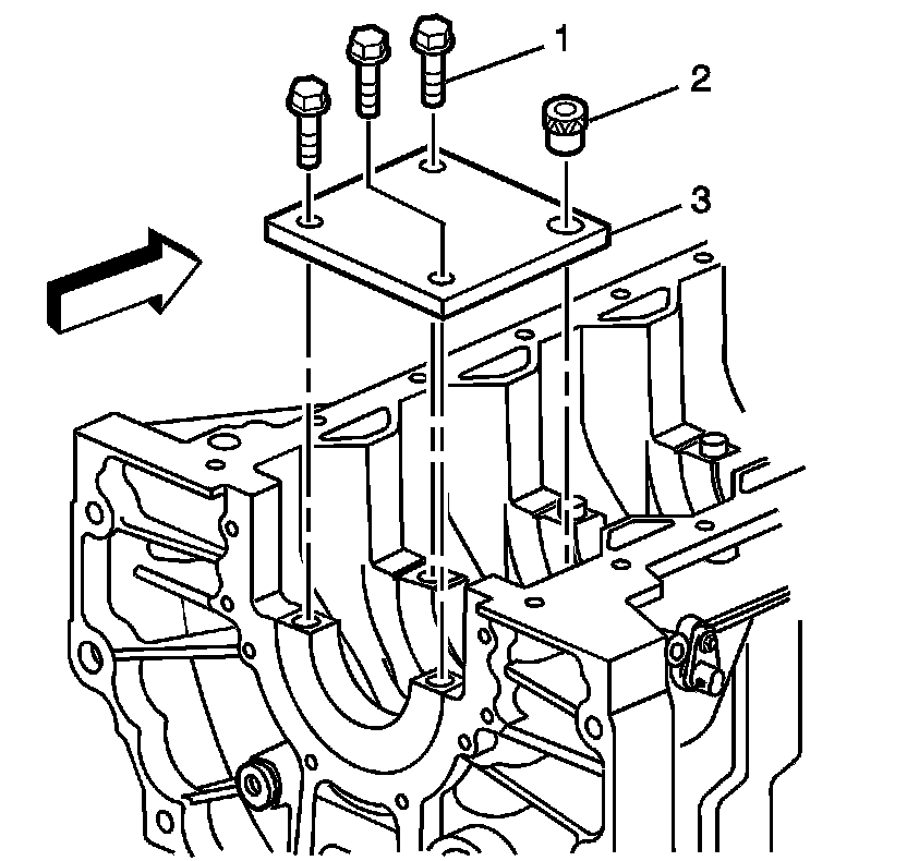 1. Position the fixture plate (3) with the bushing (2), installed over the crankshaft main cap bolt hole to be repaired.