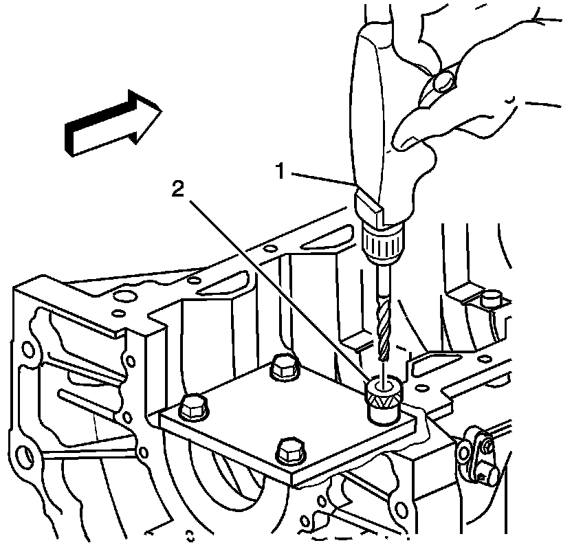 * Drill the crankshaft main bolt hole until the mark (1) on the drill aligns with the top of the drill bushing (2).