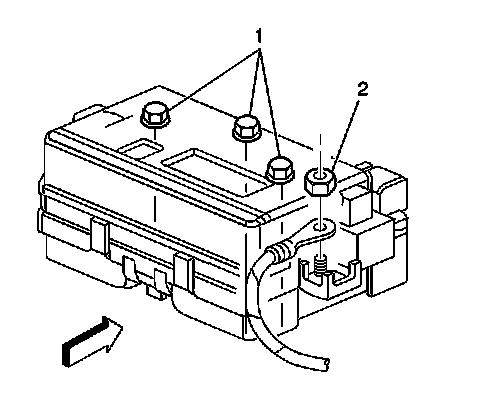 5. Remove the battery feed terminal nut (2) from the junction block.