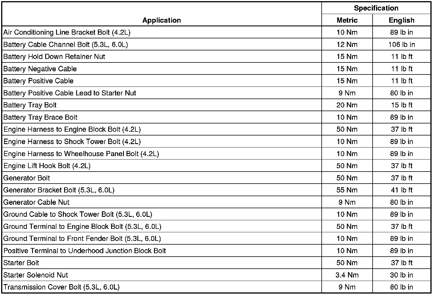 Starting and Charging: Specifications