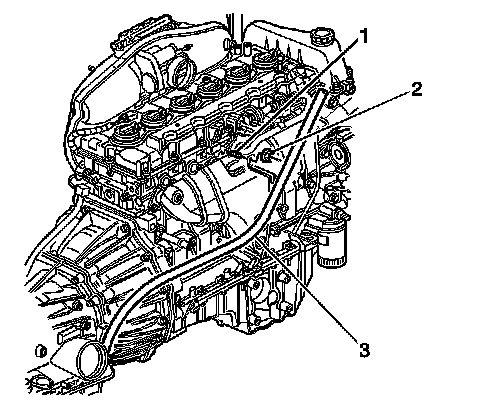 3. Remove the filler tube from the stud (1) on the right side of the engine.