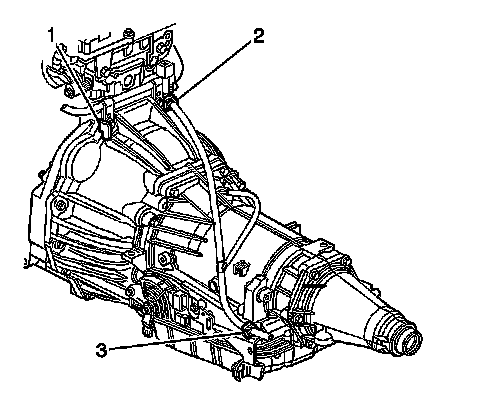 19. Remove the bolts (2, 3) that secure the fuel line brackets to the left side of the transmission.