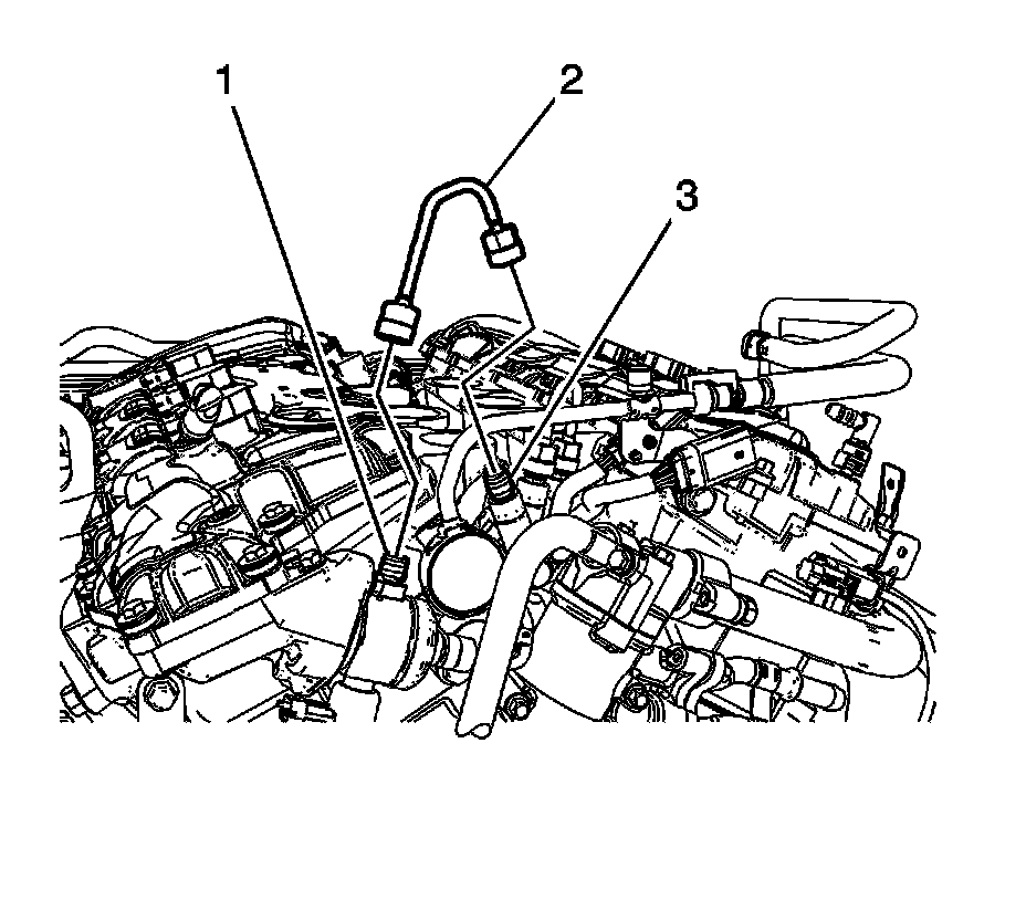 2. Position the high pressure fuel pipe (2) to the high pressure fuel pump fitting (1) and left fuel rail (3). hand tighten the fitting.