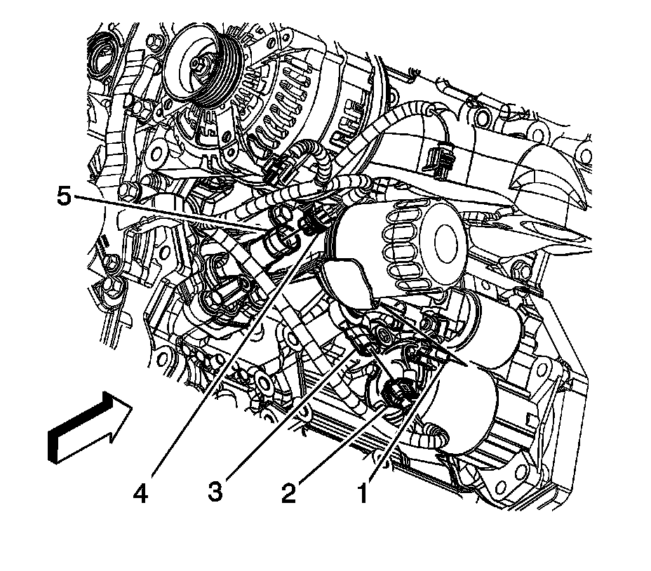 5. Remove the battery positive junction block cable terminal (2) from the starter.