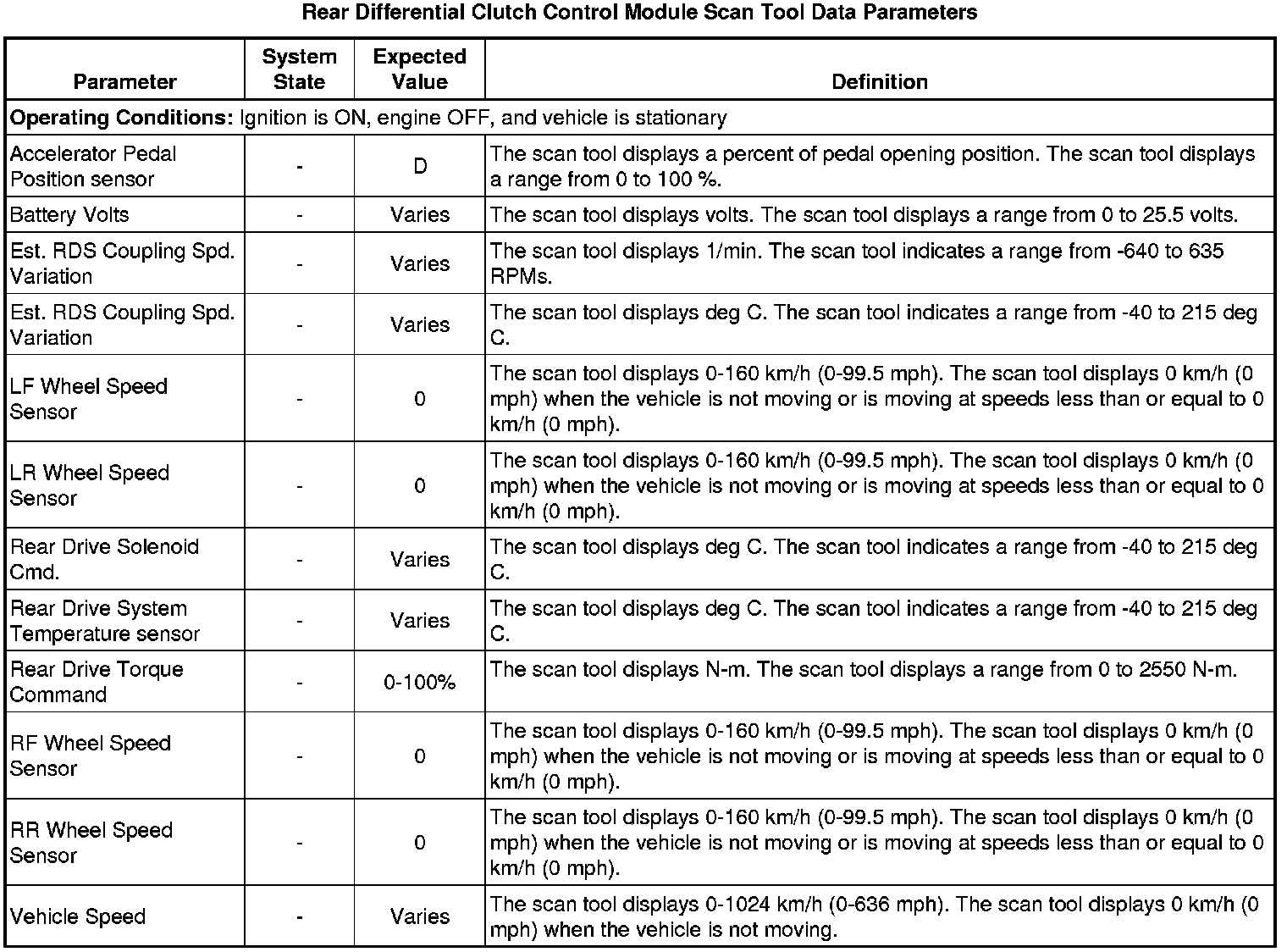 The rear differential clutch control module (CCM) Scan Tool Data List contains all the clutch control module system related parameters that are available on the scan tool. The parameters in the list are arranged in alphabetical order. The column, "Data List," indicates the location of the parameter within the scan tool menu selections.