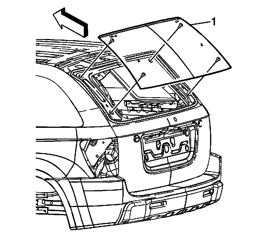 5. Remove the rear spoiler. Refer to Rear Spoiler Replacement (Acadia, OUTLOOK) (Service and Repair)Rear Spoiler Replacement (Enclave, Traverse) (Service and Repair).