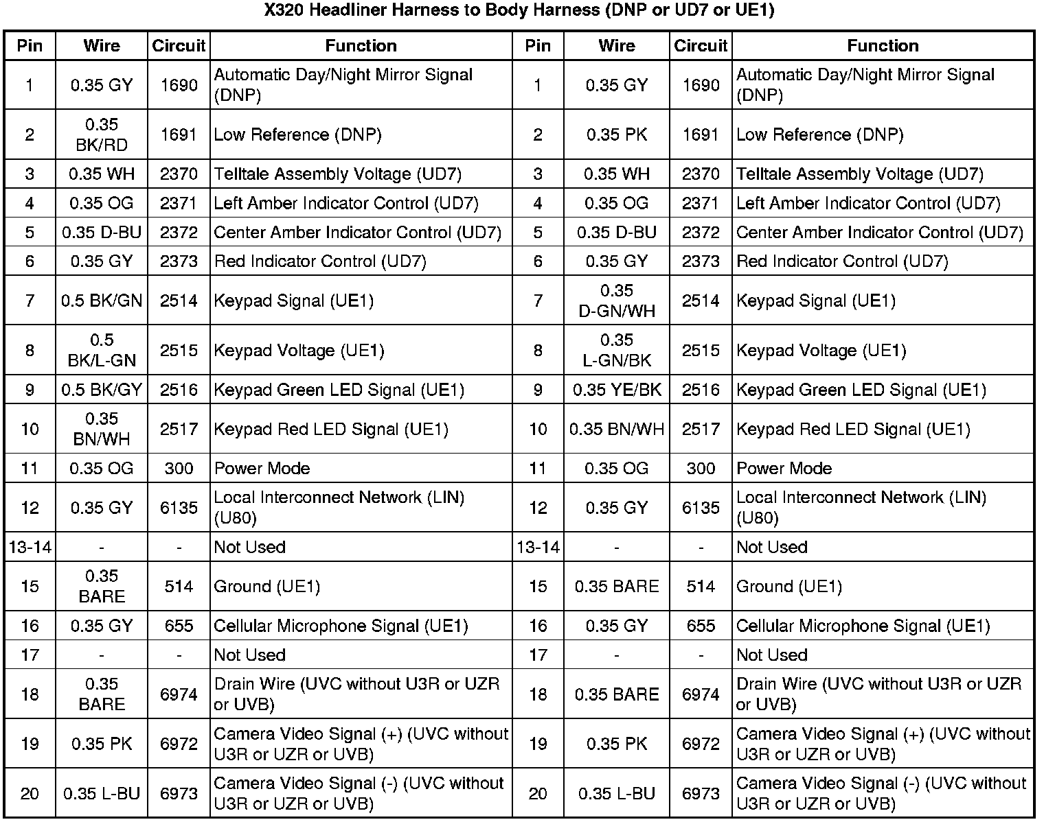 X320 Headliner Harness to Body Harness (DNP or UD7 or UE1)