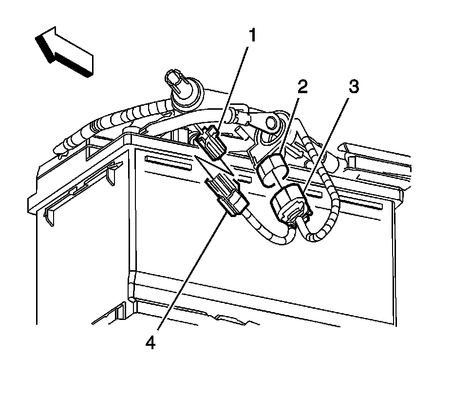 3. Disconnect the body wiring harness electrical connector (4) from the negative battery cable electrical connector (1).