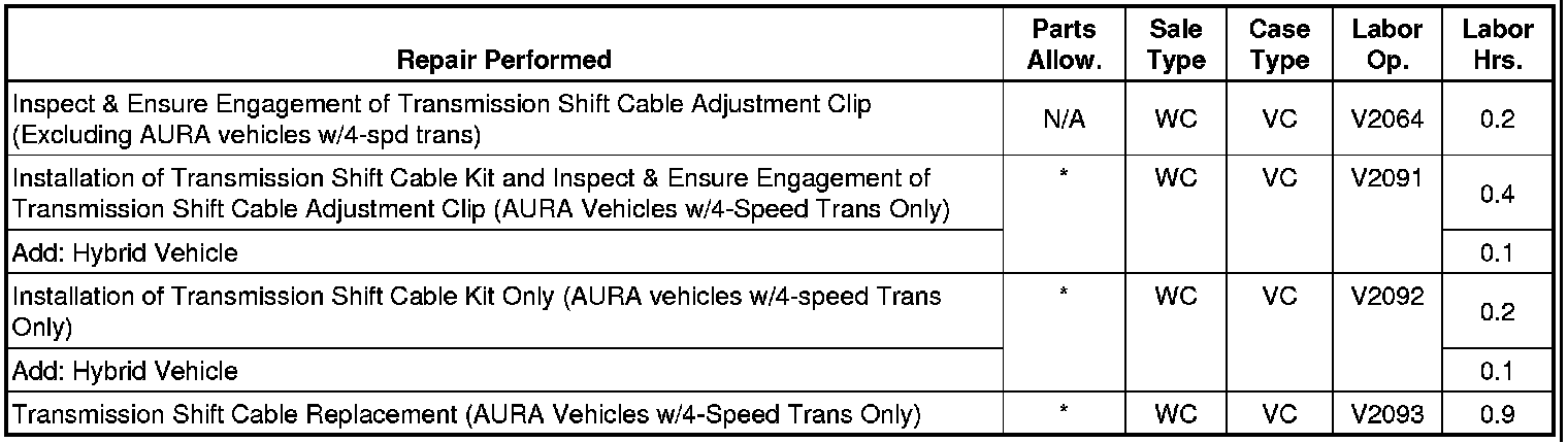 Note: If replacement of the shift cable is required on vehicles other than AURA equipped with a 4-speed transmission, H-route the claim for wholesale authorization.