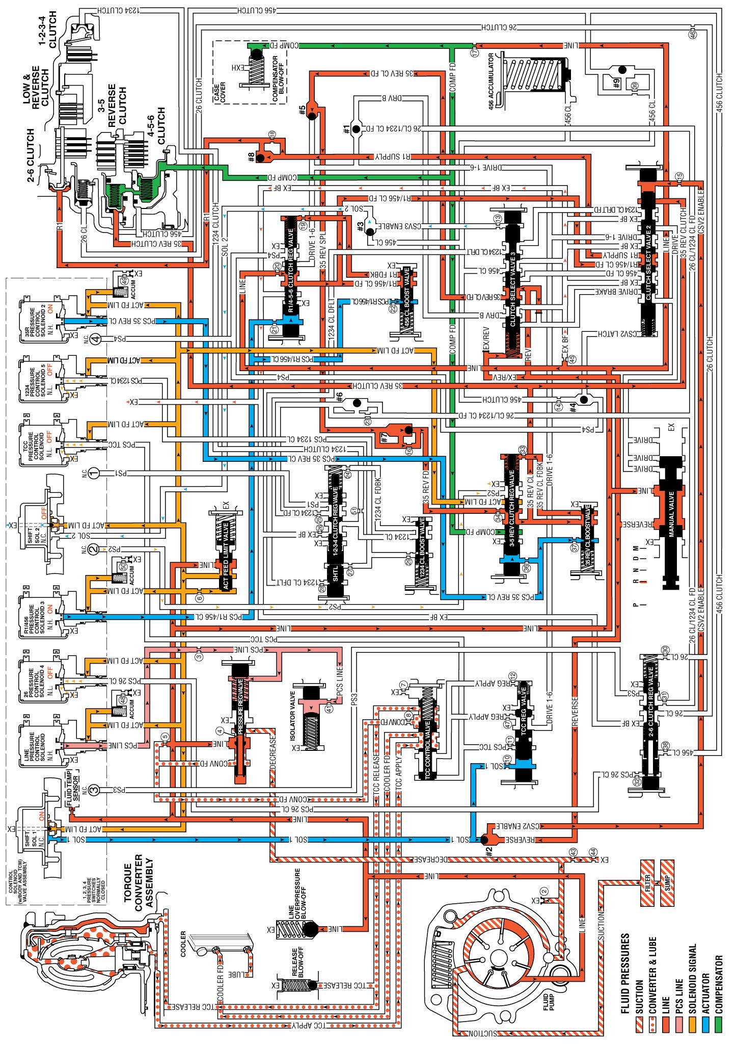 With the manual valve in the reverse position, line pressure is directed into the reverse fluid circuit to the #2 ball check valve and clutch select valve 3.