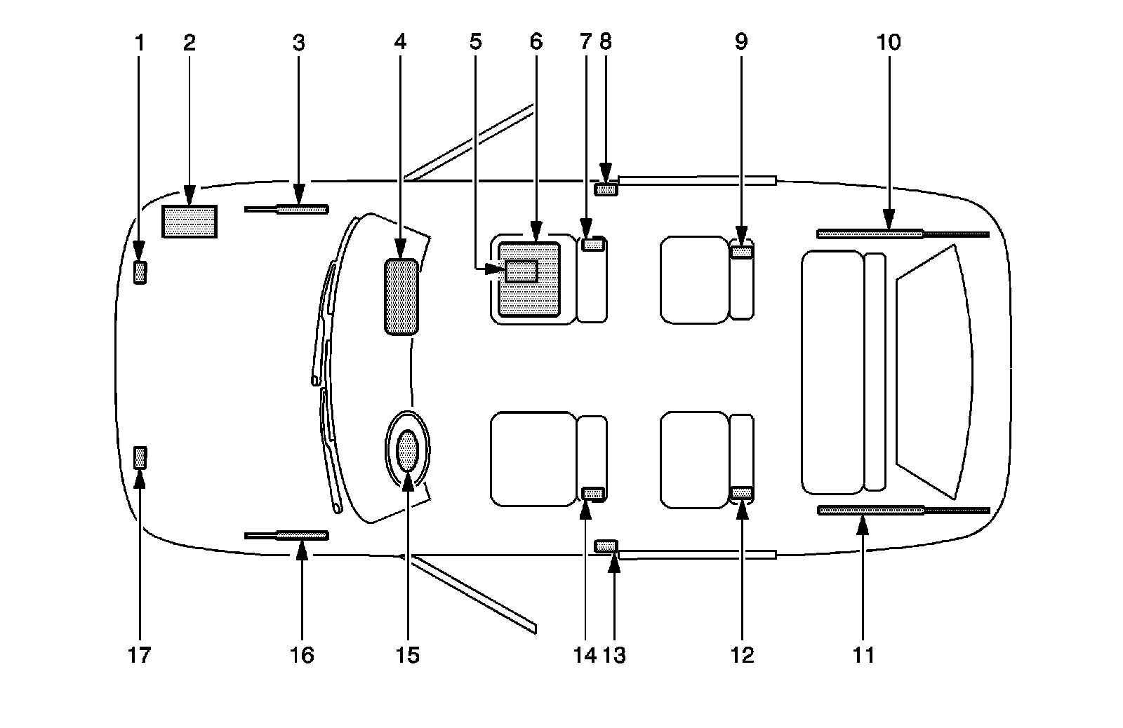 The SIR Identification Views shown below illustrate the approximate location of all SIR components available for the vehicle. This will assist in determining the appropriate SIR Disabling and Enabling for a given service procedure. Refer to SIR Disabling and Enabling Service and Repair.