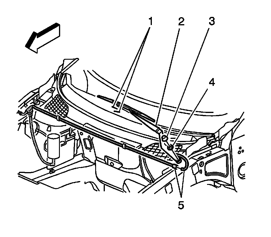 1. Position the wiper module (5) to the lower plenum in the driver side fender flange opening first.