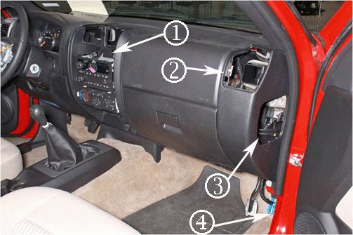 1. Remove center switch bank (1), passenger HVAC vent (2), IP cap (3) and the kick pad trim (4).