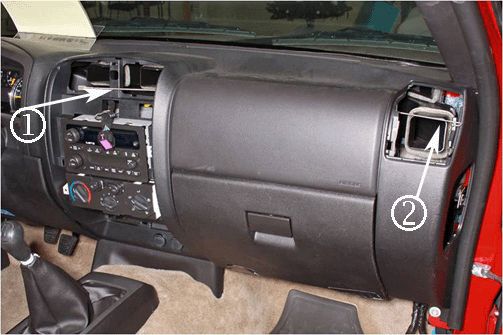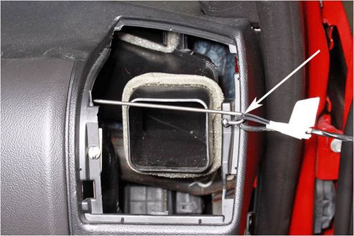 2. Insert electrical fish hook, coat hanger or equivalent from the switch bank opening (1) to the passenger HVAC opening (2) (photo above shows an electrical fish hook).