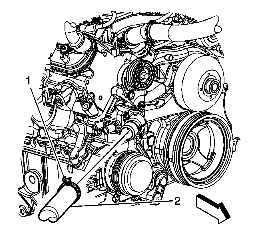 6. Position the radiator surge tank outlet hose clamp (1) at the water pump (2).