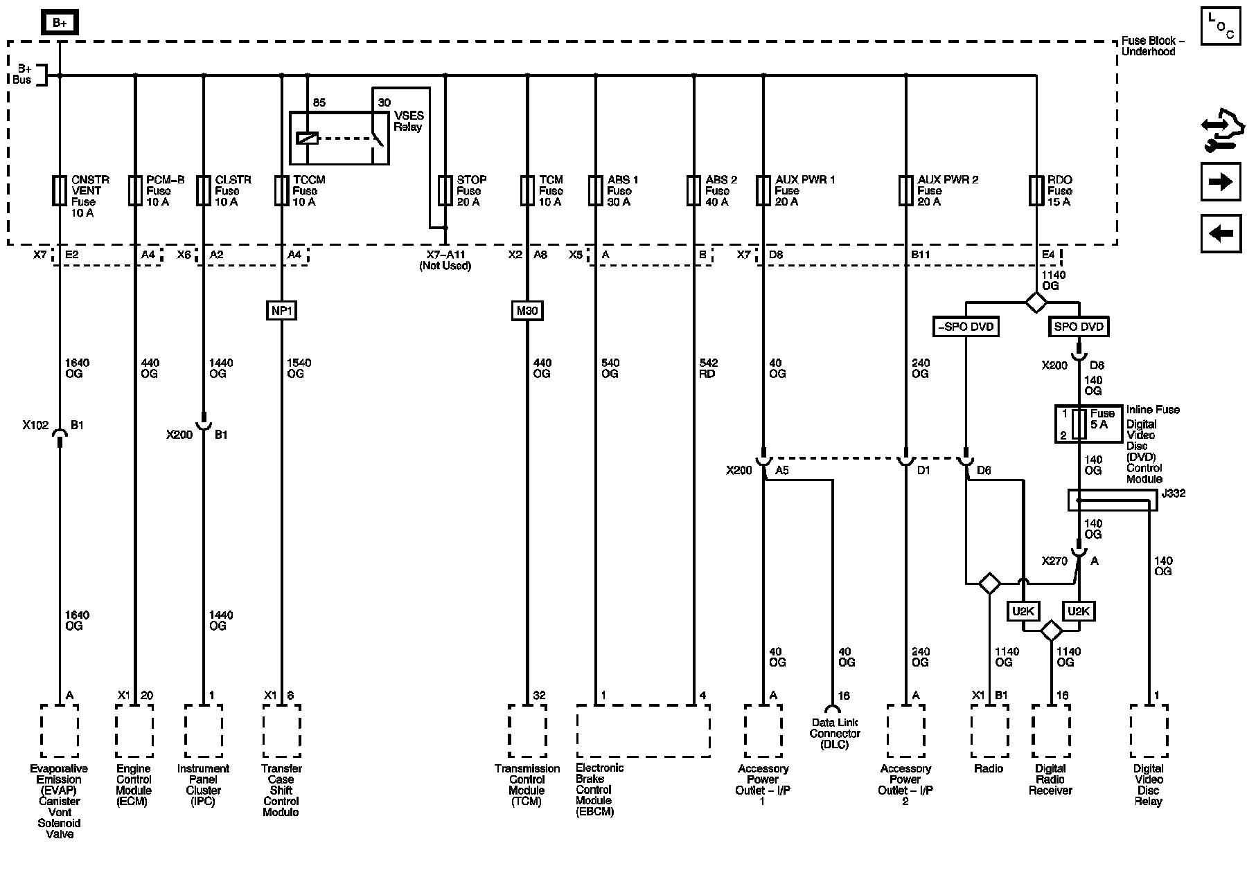 ABS 1, ABS 2, AUX PWR 1, AUX PWR 2, CNSTR VENT, CLSTR, PCM B, RDO, STOP, and TCCM Fuses