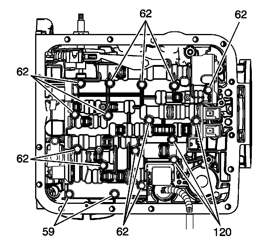 5. Install the 12 valve body bolts (62), 2 bolts (59) and 3 bolts (120) that are shown only.