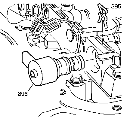 11. Install the TCC PWM solenoid valve (396) and the solenoid retainer (395).