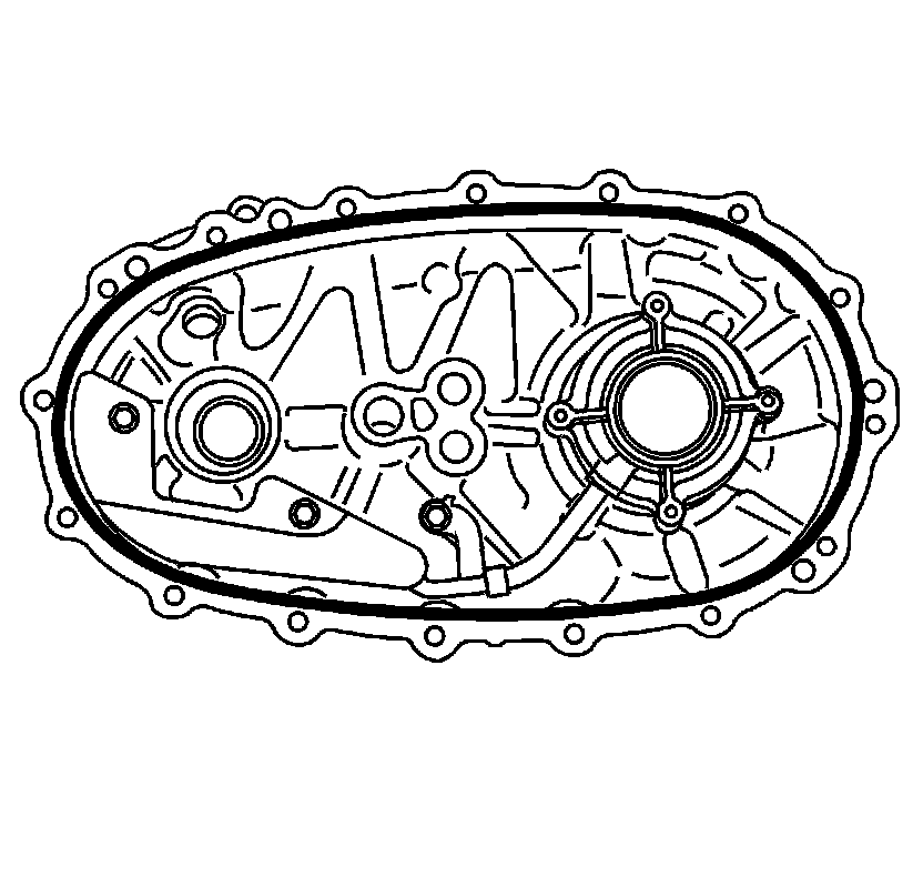 82. Apply a 3 mm (1/8 in) bead of flange sealant GM P/N 12378517 (Canadian P/N 88900757) to the sealing flange on the rear case half. Apply the sealer evenly to the inside surface of the bolt holes, with no gaps.