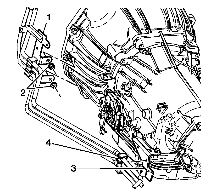16. Connect the transmission vent hose retainer (1) to the heater pipe bracket (2).